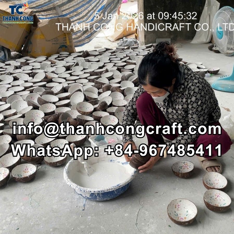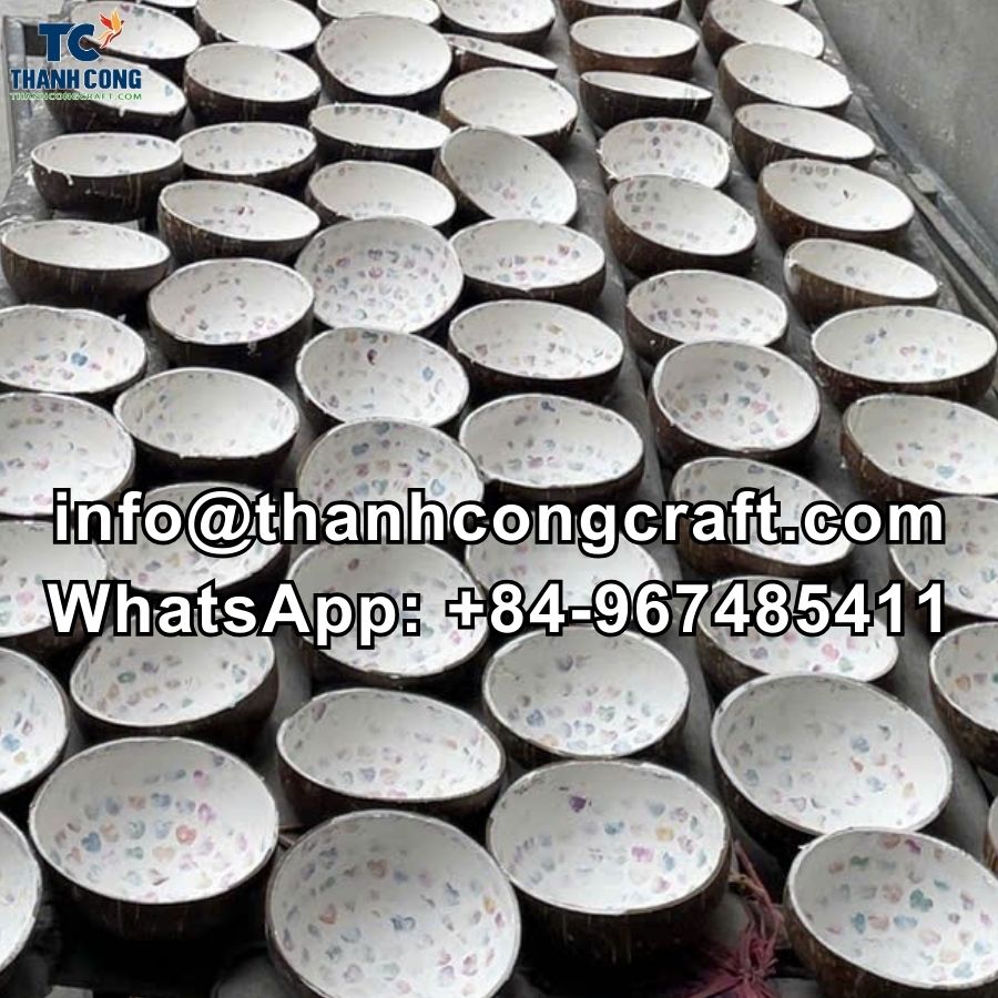 Skilled artisans shape and polish each coconut shell by hand, then add mother-of-pearl inlay. This process creates unique pieces and supports traditional craft communities.