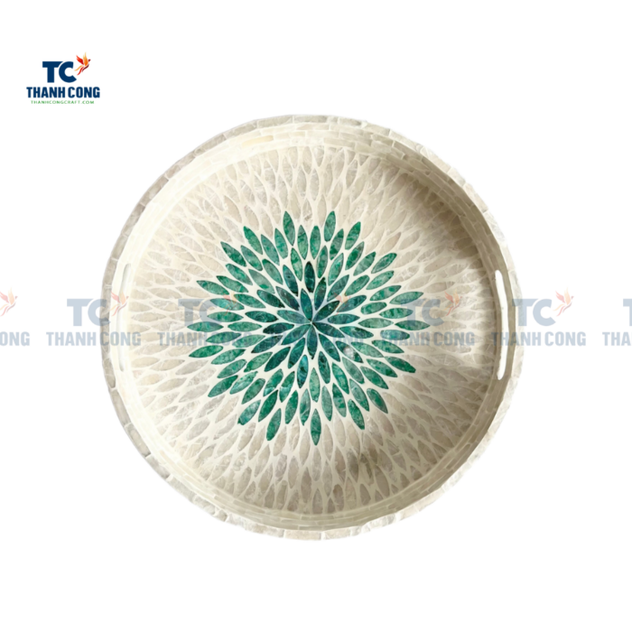 - Round Mother of Pearl trays have a timeless and elegant design. The iridescent beauty of the Mother of Pearl material adds a touch of luxury and sophistication to any setting. The round shape provides a soft and pleasing aesthetic that can complement various decor styles.