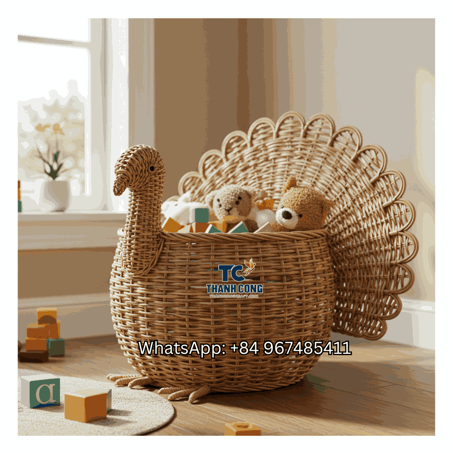 The Turkey Rattan Toy Storage Basket is a product made by Thanh Cong Handicraft Export Co., Ltd, a family-owned business based in Hanoi, Vietnam. We have over 100 years of experience in producing handcrafted items from rattan and other natural materials.