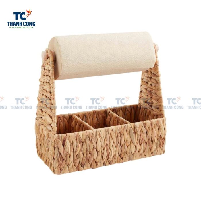 This woven cutlery caddy have a paper roll holder and 3 sections for organizing different types of utensils. These sections can be customized in your desired size and shape to accommodate various utensil sizes and shapes, providing versatile storage options.
