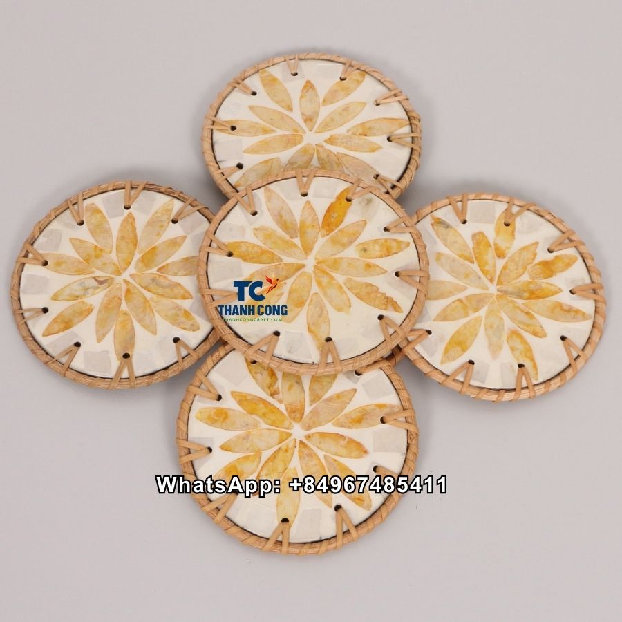 Wholesale Yellow Leaf Rattan Mother Of Pearl Coaster | Premium Handmade Drinkware from Vietnam – TCRCO 8915