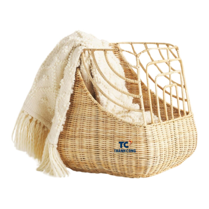 Our woven wicker basket has a square base that transitions into a more structured, open-wave pattern on the upper section. The wicker is tightly woven, giving the lower part of the basket a solid and sturdy appearance, while the upper part is more open and airy, formed by rattan or wicker strips creating geometric shapes.